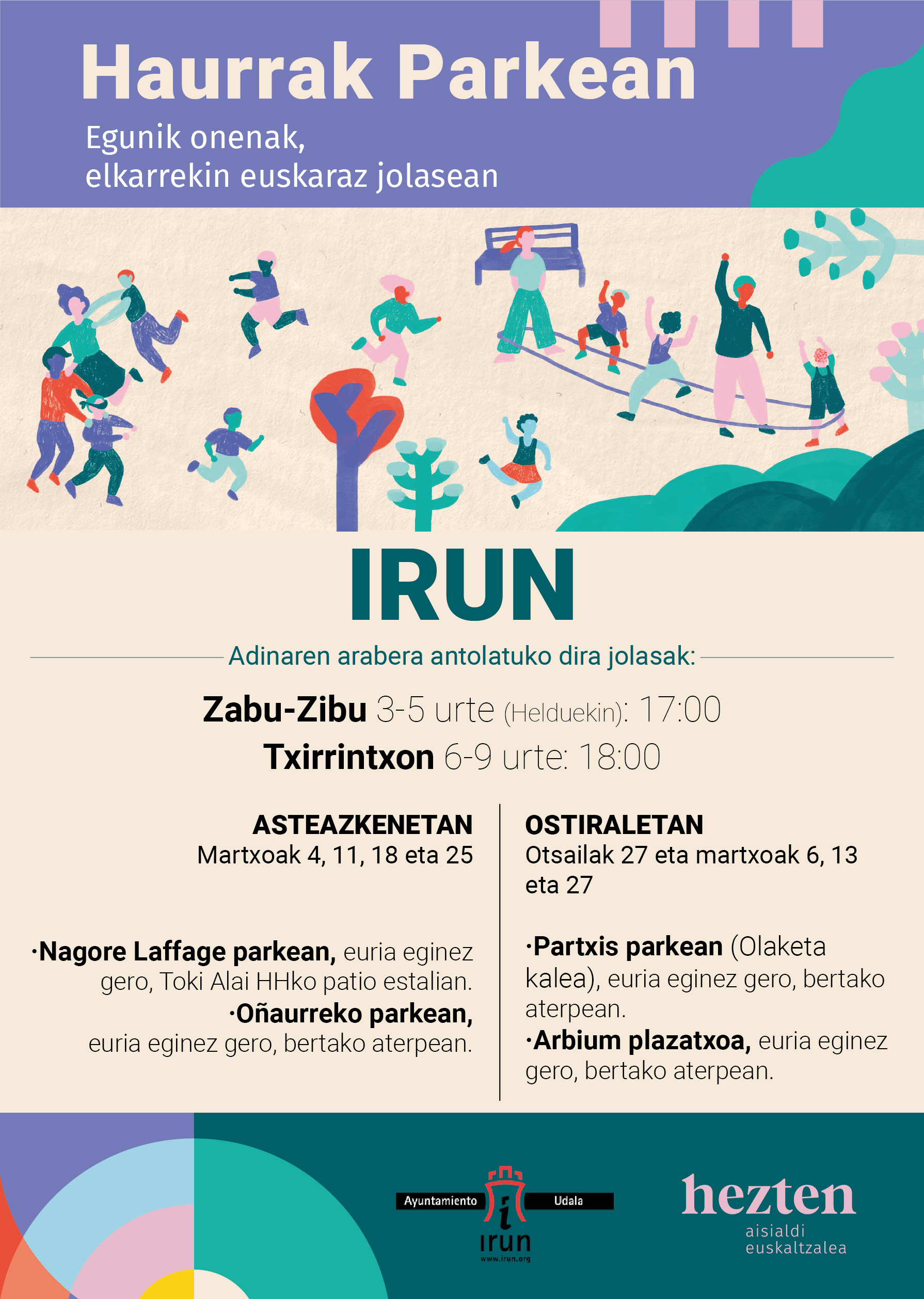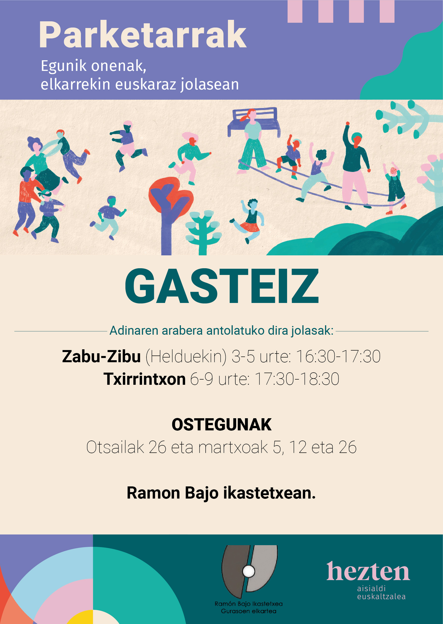 Ce programme est mis en place dans les parcs et s’adresse à des enfants de 3 à 5 ans et leurs parents (ou responsable), plus deux éducateurs d’Hezten. Nous organisons des jeux en combinant la transmission linguistique dans la famille et dans les loisirs.